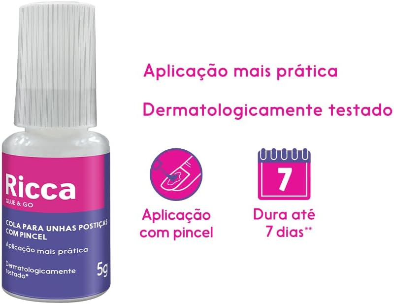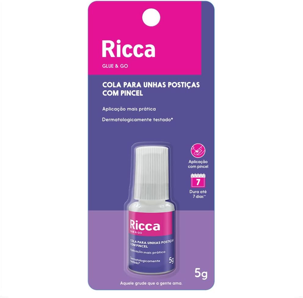 A cola fácil. Ricca é indicada para aplicação de unhas postiças de modo mais fácil, já que seu pincel garante maior controle da quantidade de produto depositada nas unhas naturais, alcançando até os cantinhos mais difíceis. Função cola líquida para unhas postiças.
