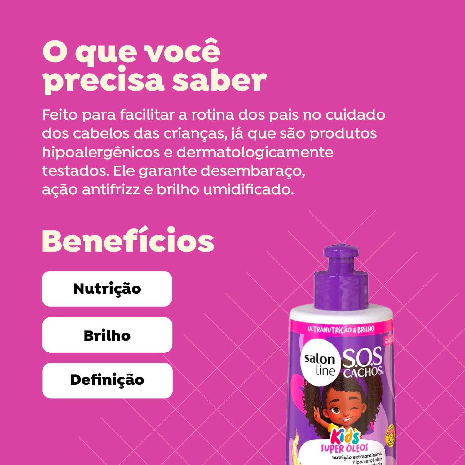 Cachinhos ultra nutridos! O Creme de Pentear da linha S.O.S Cachos Kids Nutrição em Ação foi feito para facilitar a rotina dos pais no cuidado dos cabelos das crianças, já que são produtos hipoalergênicos e dermatologicamente testados. Ele garante desembaraço, ação antifrizz e brilho umidificado. Indicado para o tratamento de cabelos embaraçados, sem brilho e com frizz. Ativos: Contém Manteiga de Karité, rica em ácidos graxos essenciais, além de Óleo de Argan, com alto poder de nutrição. Modo de usar: Aplique o Creme de Pentear S.O.S Cachos Kids do comprimento às pontas, desembaraçando com um pente de dentes largos. Não enxágue. Uso diário. Produto vegano. Uso recomendado a partir de 03 anos. Salon Line: produtos que valorizam sua beleza única, em cada momento da sua jornada capilar.
