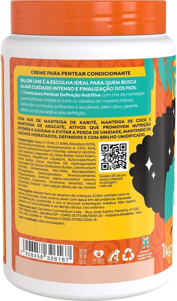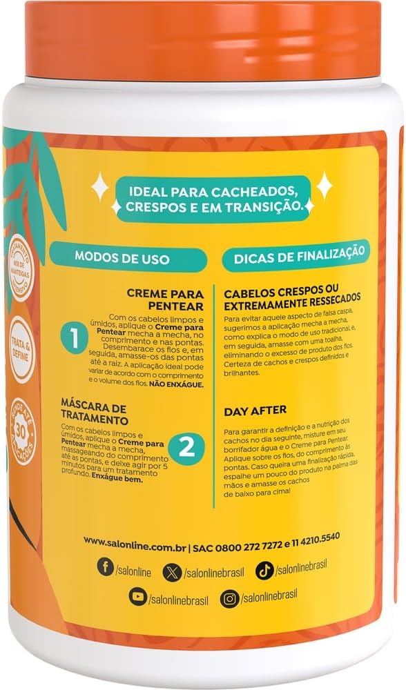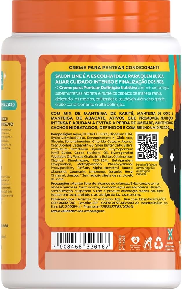 Definição Nutritiva! O Creme para Pentear 2 em 1 Definição Nutritiva hidrata e nutre os cabelos de maneira intensa, deixando-os macios, brilhantes e saudáveis, podendo ser utilizado como Creme de Pentear e Máscara de Tratamento. Além disso, garante efeito condicionante e alta definição. Desenvolvido para cabelos cacheados e crespos, 3ABC e 4ABC, o produto é indicado para nutrição, definição, brilho e efeito umidificado. Ativos: O Creme para Pentear para cabelos cacheados e crespos possui Manteiga de Karité, Manteiga de Coco e Manteiga de Abacate. Sua formulação retém a umidade, mantendo cachos hidratados, definidos e com brilho umidificado. Modo de uso: Creme para Pentear Com os cabelos limpos e úmidos, aplique o Creme para Pentear mecha a mecha, no comprimento e nas pontas. Desembarace os fios e, em seguida, amasse-os das pontas até a raiz. A aplicação ideal pode iar de acordo com o comprimento e o volume dos fios. Não enxágue. Máscara de Tratamento Com os cabelos limpos e úmidos, aplique o Creme para Pentear mecha a mecha, massageando do comprimento até as pontas, e deixe agir por 5 minutos para um tratamento profundo. Enxágue bem. Uso recomendado a partir dos 12 anos. Salon Line: produtos que valorizam sua beleza única, em cada momento da sua jornada capilar.