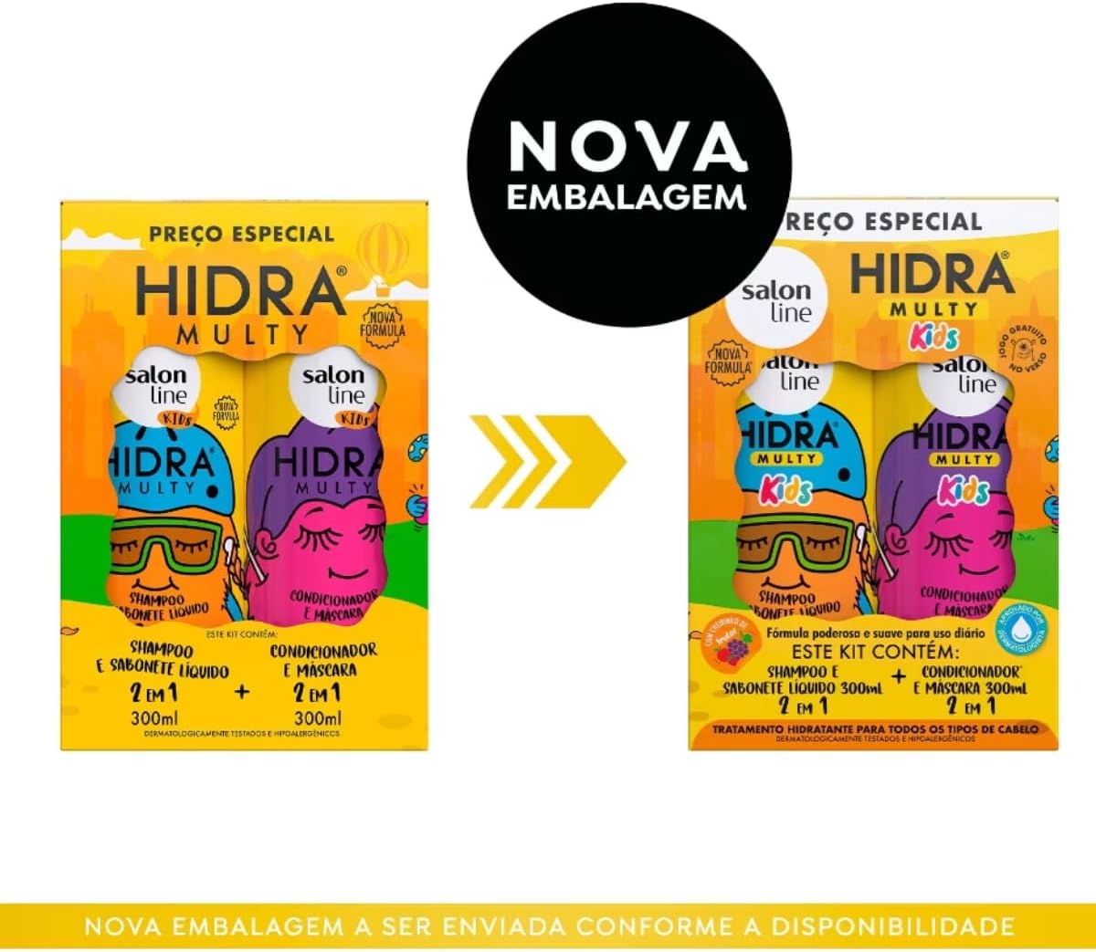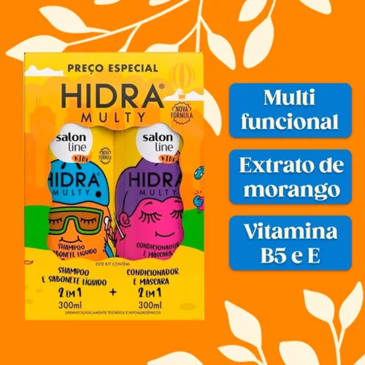 HIDRA MULTY KIDS. Desenvolvido com uma fórmula especial para cuidar dos fios dos pequenos, o kit shampoo e condicionador é vegano e multifuncional.