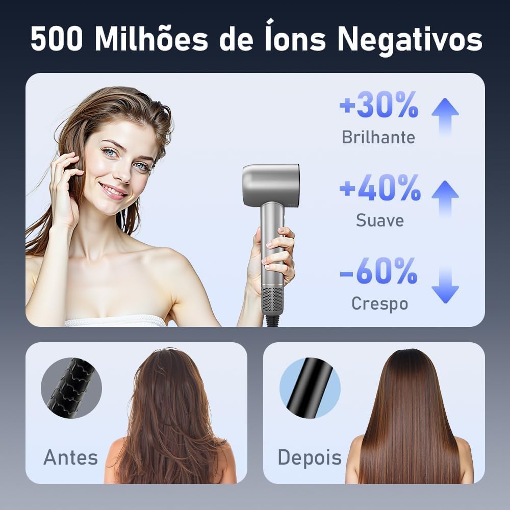ÍONS QUE TRANSFORMAM + SILÊNCIO DE BIBLIOTECA – Libere 5 bilhões de íons negativos para neutralizar a eletricidade estática e selar a hidratação, garantindo fios sedosos e brilhantes. Com tecnologia de redução de ruído de apenas 65 dB, é perfeito para famílias e até mesmo para pets! Seu design certificado e chip antifalhas proporcionam segurança total, mesmo com crianças ao redor. Compatível com 110V/127V.