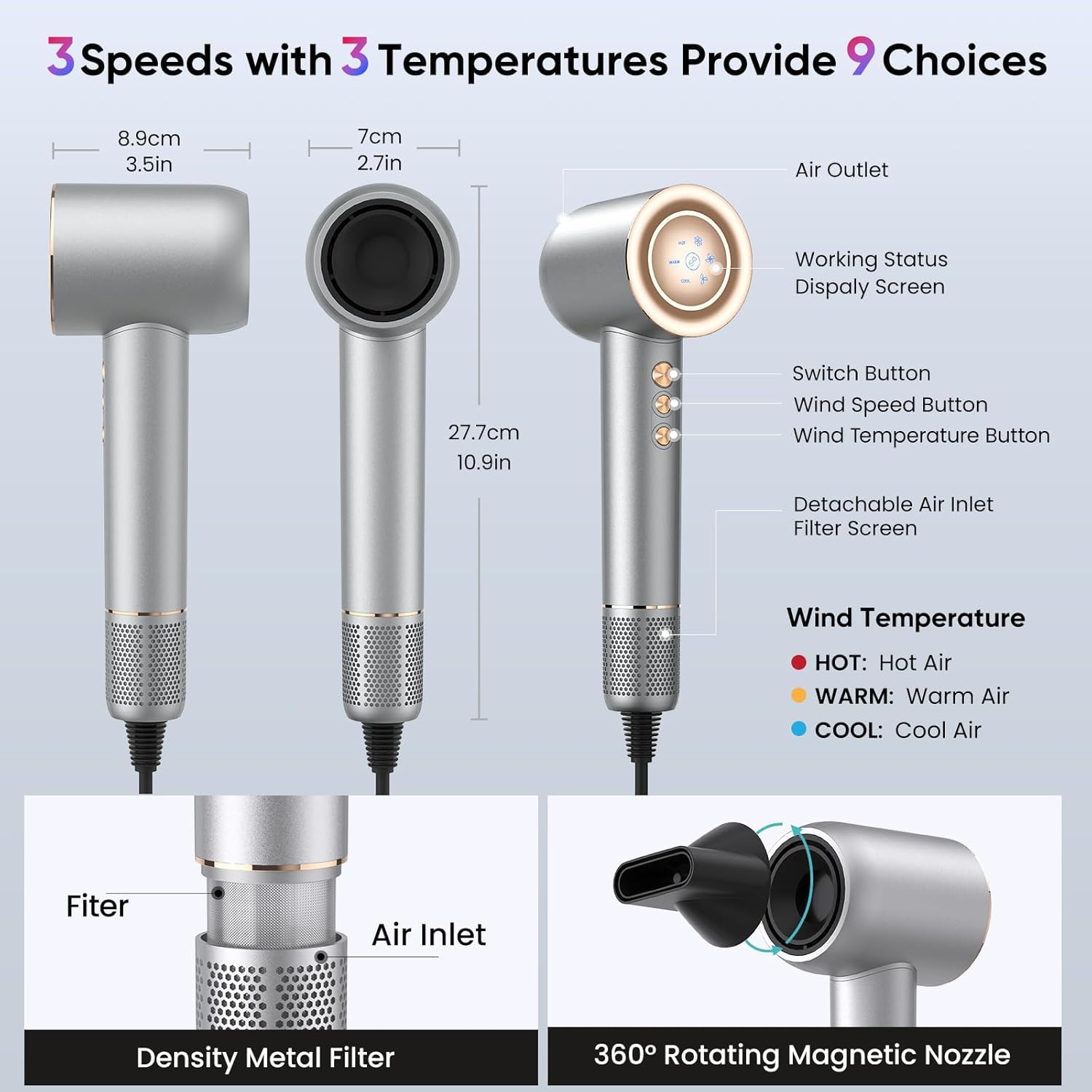 Experiência personalizada, cuidado total – Este secador de cabelo é facilmente personalizável com 3 temperaturas e 3 velocidades para uma experiência de secagem única. Sensores ultrassensíveis ajustam a temperatura 100x por segundo, garantindo calor uniforme e seguro (máx. 90°C) – proteção total contra danos térmicos!