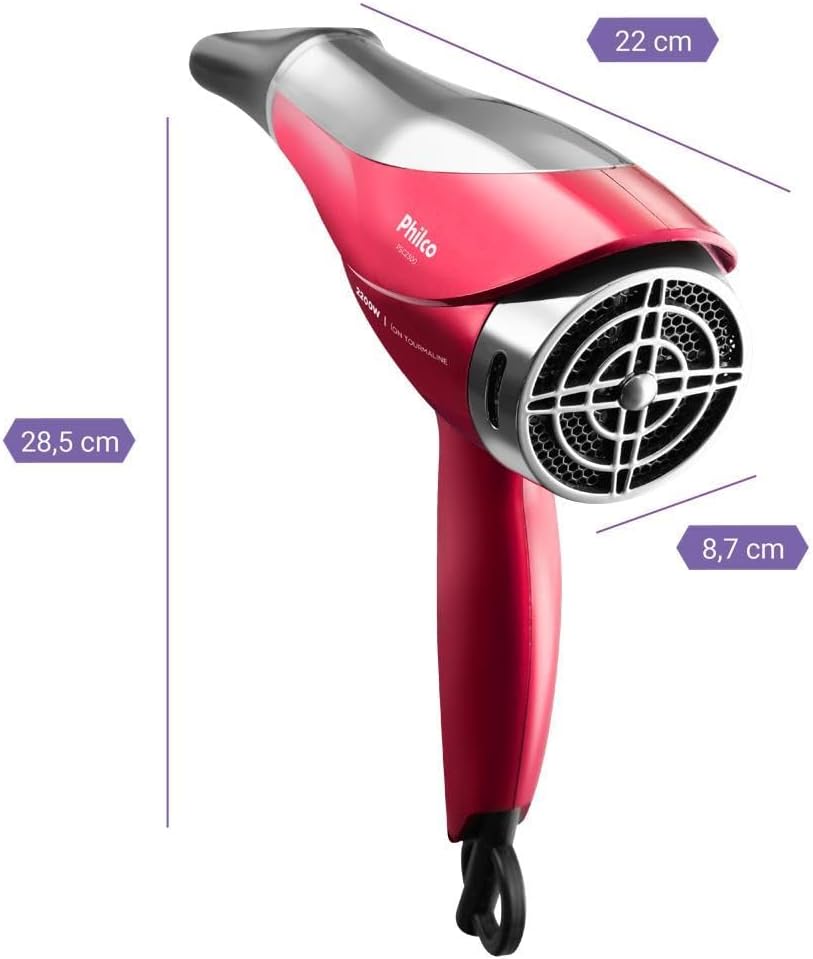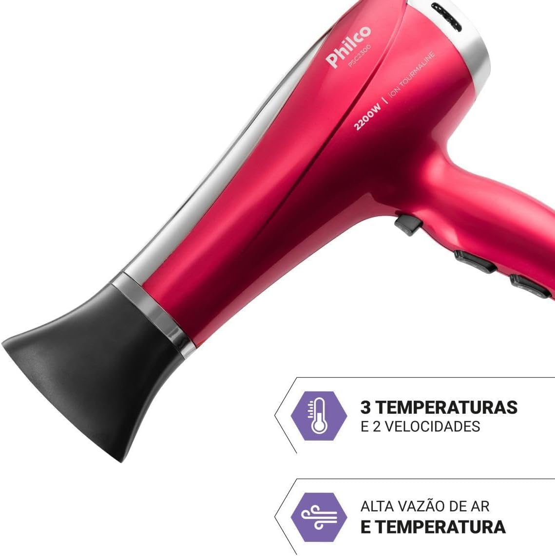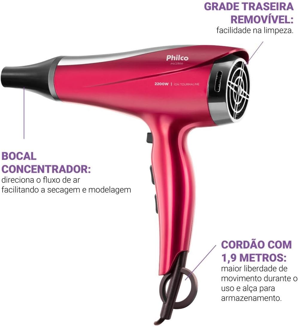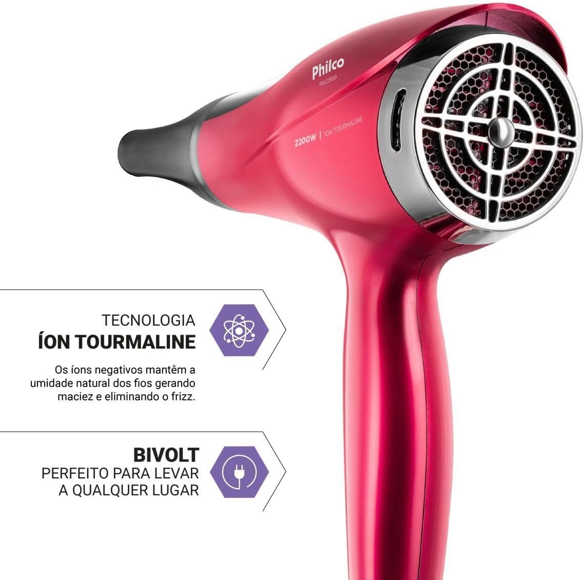 O Secador de Cabelos Philco Bivolt 2200W PSC2300 Motor DC é ideal para uso pessoal! Com potência de 2200W, proporciona agilidade e rapidez na secagem e modelagem dos seus cabelos. Equipado com jato de ar frio, ajuda no acabamento, na modelagem dos fios e no fechamento das cutículas capilares. Além de contarcom 6 combinações, que são ideais para todos os tipos de cabelos. Possui motor DC, que além de garantir alta performance, torna o produto mais leve e prático de manusear. Tudo isso, com tecnologia Íons Tourmaline, íons negativos que mantêm a umidade natural dos fios gerando maciez e eliminando os indesejáveis frizz no dia a dia. O Secador de Cabelos Philco PSC2300 tem design arrojado e um bocal concentrador que direciona o fluxo de ar facilitando a secagem e modelagem. Um produto bivolt, ideal para le a qualquer lugar! Além disso, conta com cordão com 1,9m, que proporciona mobilidade na medida certa. Secador de Cabelos Philco PSC2300, potência, tecnologia e um design de arrasar!