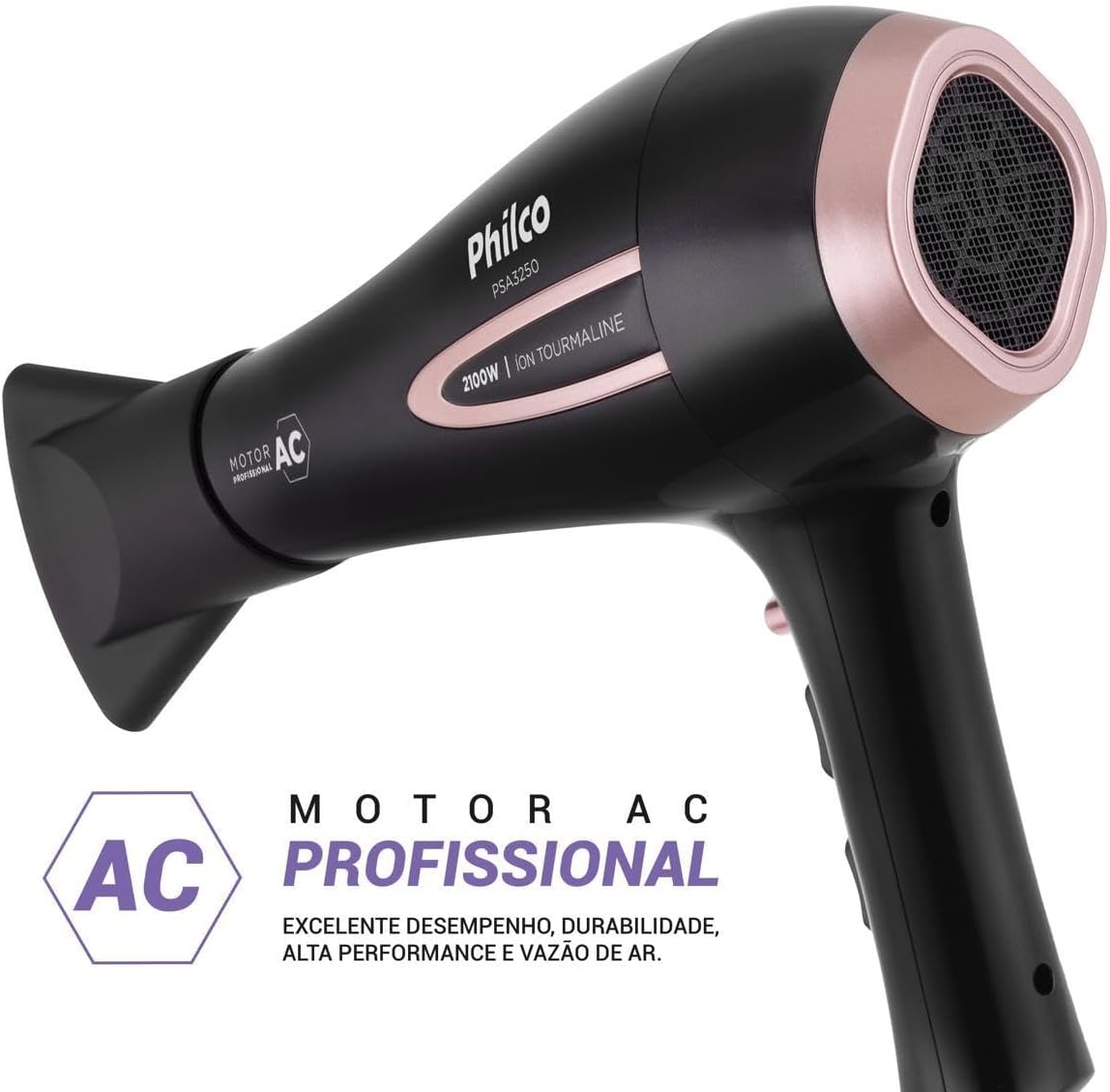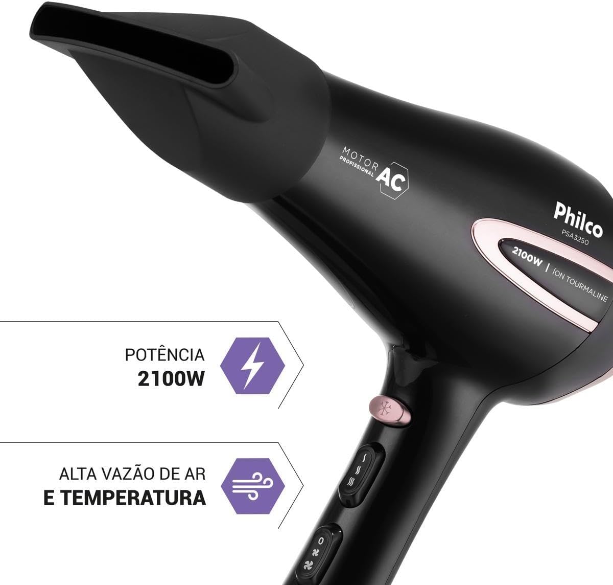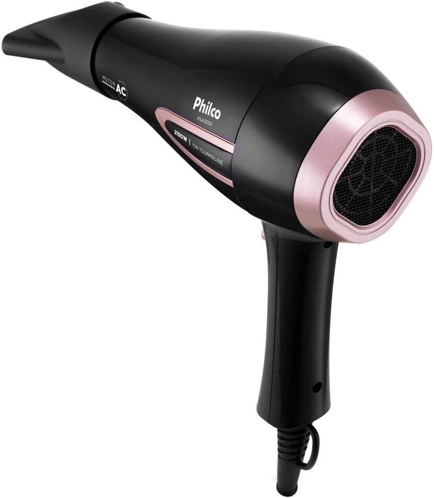 O Secador de Cabelos Philco PSA3250 Íons Tourmaline 2100W é a combinação perfeita de potência, inovação e durabilidade. Com sua incrível potência de 2100W, ele garante alto desempenho na hora de secar e cuidar dos seus cabelos. Equipado com um motor AC Profissional de alta performance e temperatura, o PSA3250 da Philco oferece mais vento e menos ruído. Além disso, possui Íons Tourmaline, responsável por deixar seus cabelos mais macios, brilhantes e livres de frizz. E para facilitar ainda mais o processo de secagem e modelagem, o secador vem com um bocal concentrador que direciona o calor de forma eficaz, tornando a secagem e a modelagem dos fios mais precisa e eficiente. O Secador de Cabelos PSA3250 oferece ainda a flexibilidade de escolher entre 3 velocidades e 2 temperaturas. Isso significa que você pode personalizar o nível de calor e a intensidade do vento de acordo com seu tipo de cabelo e preferências pessoais. Desempenho profissional, alta potência e tecnologia de íons para cabelos mais saudáveis e brilhantes, conte com o Secador de Cabelos PSA3250 da Philco!
