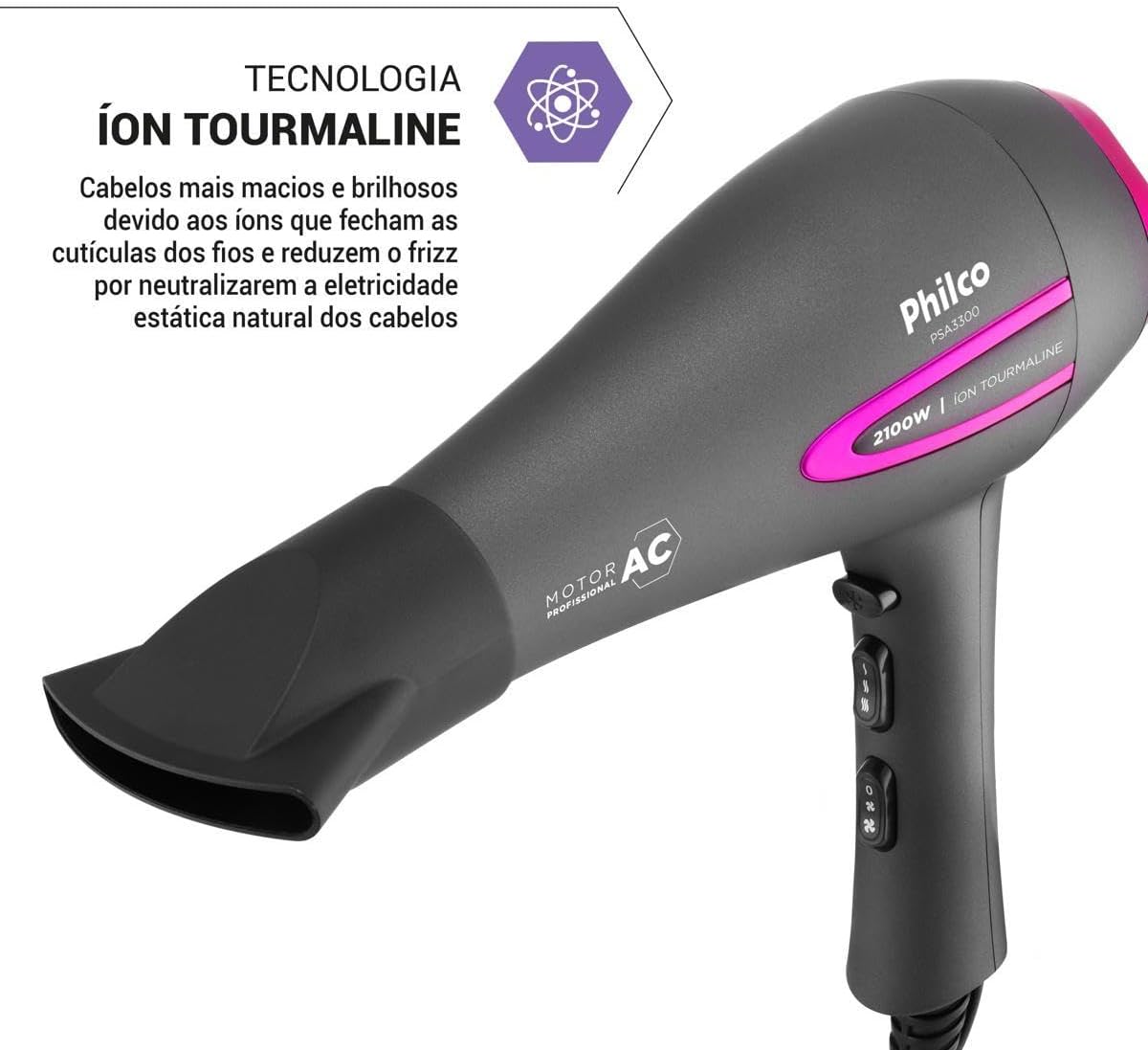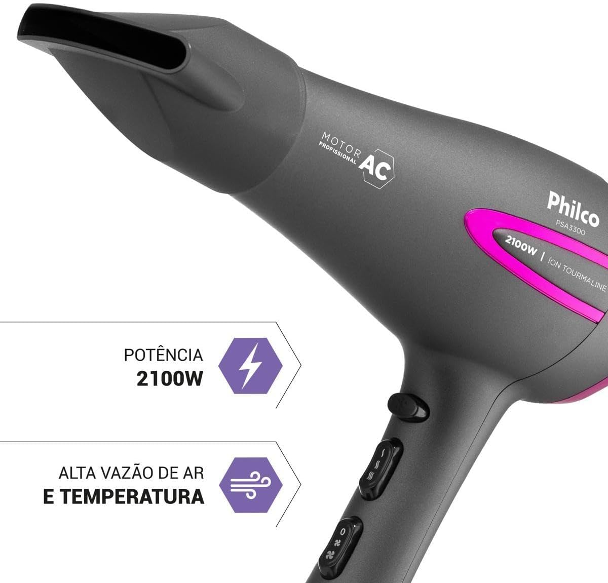 Mantenha o controle do seu cabelo em suas mãos com o Secador de Cabelos Philco PSA3300. Desenvolvido com motor AC profissional, o Secador de Cabelos Philco desempenha com mais vento e menos ruído, sem deixar a alta performance e temperatura. Com incríveis 2100W, ele garante força, poder e durabilidade em um único secador. Além disso, a tecnologia íons tourmaline deixa seus cabelos mais macios e brilhosos devido aos íons que fecham as cutículas dos fios e reduzem o frizz por neutralizarem a eletricidade estática natural dos cabelos. Já o jato de ar frio do Secador auxilia no acabamento, enquanto o bocal concentrador com saída fina concentra e direciona o calor, facilitando a secagem e modelagem dos fios. Tudo isso, com cordão elétrico de 1,8m que proporciona mobilidade na medida certa durante o uso do aparelho, sem dor nos braços. O Secador de Cabelos Philco PSA3300 possui três velocidades e duas temperaturas, uma variedade para diferentes tipos de cabelos. Escolha a melhor que combina com a sua necessidade para ter cabelos secos e bonitos todos os dias! Eficiência e potência! Seus cabelos macios, brilhantes e prontos para arrasar com o Secador de Cabelos Philco PSA3300!
