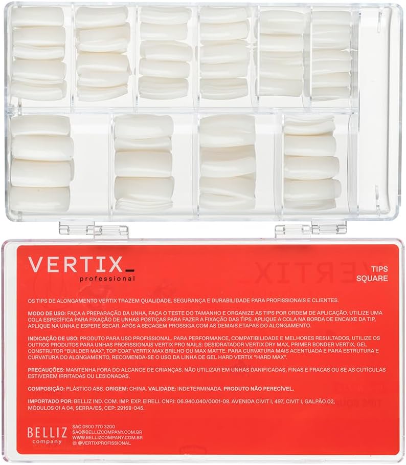 A Caixa Tips Square 500 Unidades Vertix Professional oferece a praticidade e a versatilidade que você precisa para criar unhas postiças deslumbrantes em qualquer ocasião.