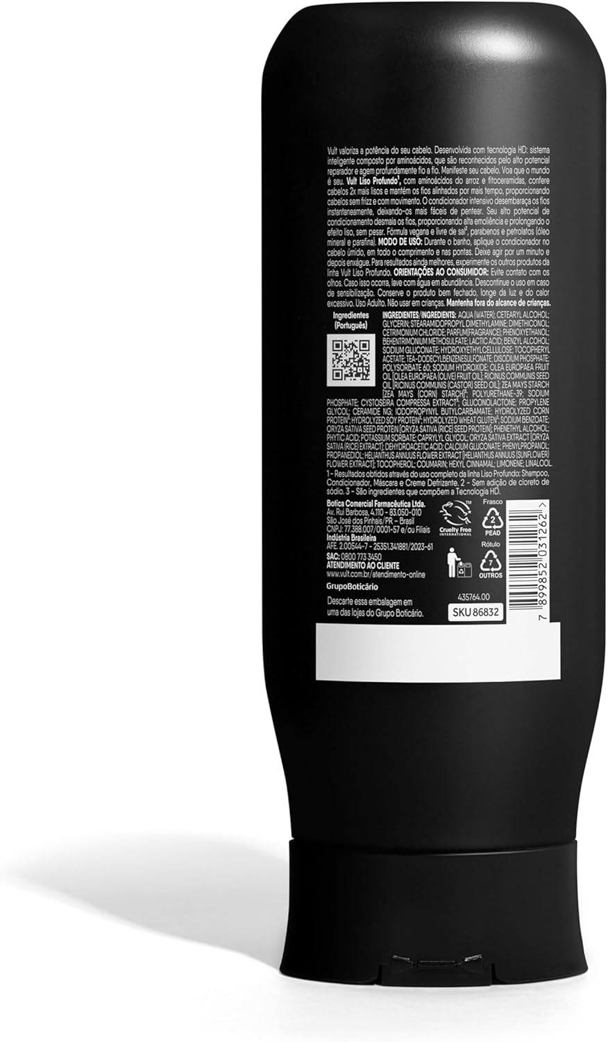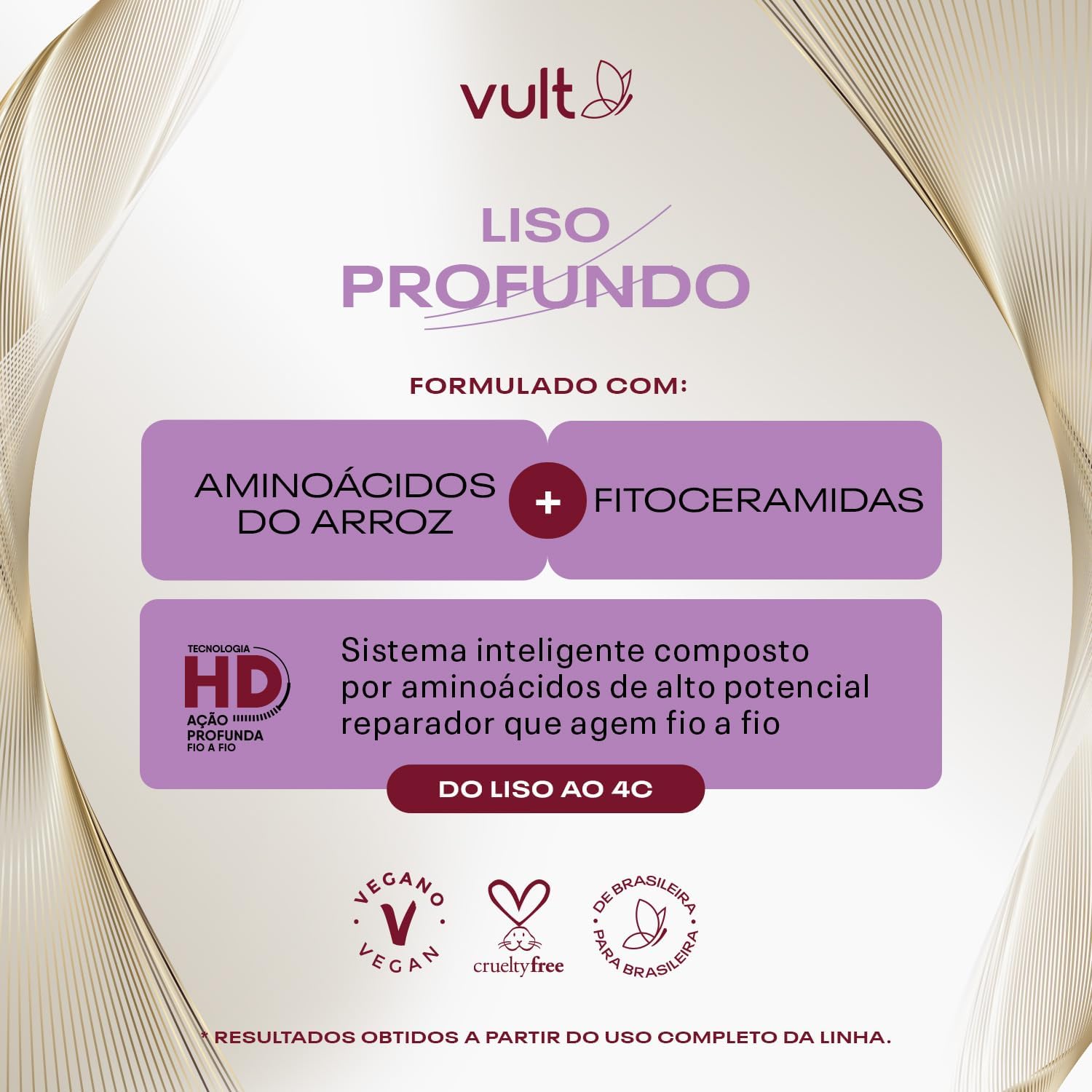 Vult Cabelos chegou com Condicionador Intensivo Vult Liso Profundo em nova volumetria. O queridinho que você já ama desembaraça os fios, deixando-os mais fáceis de pentear. Além disso, proporciona fios mais lisos, sem frizz e com movimento. Enriquecido com aminoácidos do arroz e fitoceramidas, este condicionador Vult proporciona hidratação intensa e desembaraço instantâneo dos fios, deixando-os mais alinhados. Além disso, conta com a Tecnologia HD, um sistema inteligente composto por aminoácidos, que são reconhecidos pelo alto potencial reparador e agem profundamente fio a fio. Outros benefícios do Condicionador Intensivo Liso Profundo incluem: – Alinha e sela os fios; – Bloqueia o frizz e desmaia o cabelo; – Proporciona alta emoliência prolongando o efeito liso sem pesar; – Fórmula vegana e livre de sal**, parabenos e petrolatos (óleo mineral e parafina). Marca 100% brasileira, Vult chegou para incenti a mudança e a transformação como uma verdadeira fonte de beleza e realização pessoal. Democrática, empoderadora e versátil, a marca traz um amplo portfólio em make, cabelos e skincare. Tudo cuidadosamente desenvolvido para facilitar o dia a dia daqueles que conhecem a importância do autocuidado e do verdadeiro bem-estar. Nenhum produto Vult é testado em animais, ou seja, este item possui selo Cruelty Free.
