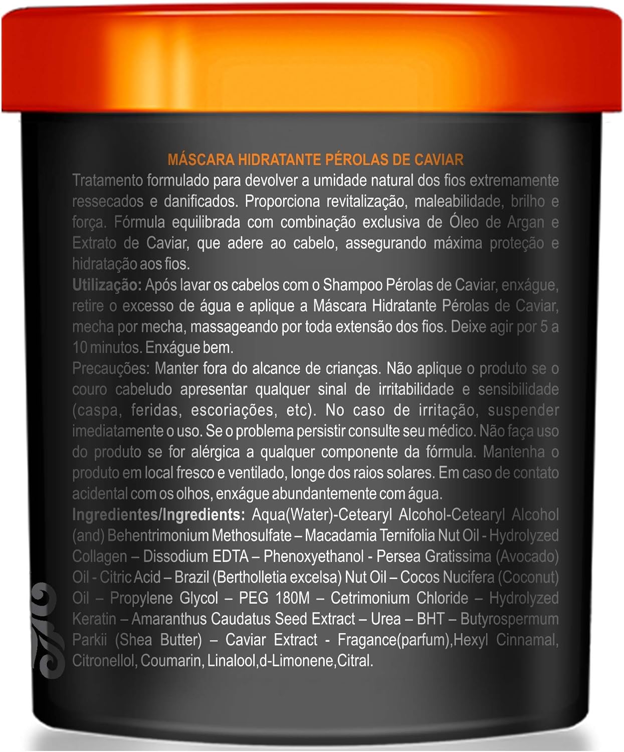 Pérolas de Caviar – Máscara Hidratante (1Kg) O que é? Esta máscara é um tratamento formulado para devolver a umidade natural aos fios extremamente ressecados e danificados. Ela proporciona revitalização, maleabilidade, brilho e força aos seus cabelos. Sua fórmula equilibrada contém uma combinação exclusiva de Óleo de Argan e Extrato de Caviar verde, garantindo máxima proteção e hidratação aos fios. Como usar? Após la os cabelos com o Shampoo Hidratante Pérolas de Caviar, enxágue bem e retire o excesso de água. Em seguida, aplique a Máscara Hidratante Pérolas de Caviar, mecha a mecha, massageando por toda a extensão dos fios. Deixe a máscara agir por 5 a 10 minutos para obter melhores resultados. Após o tempo de pausa, enxágue bem.