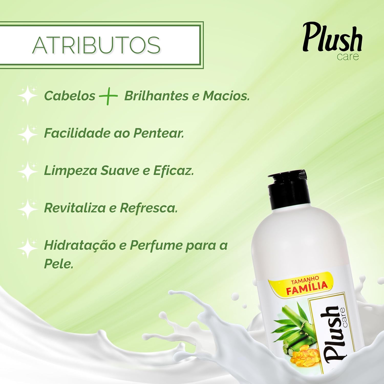Deixa os cabelos brilhantes e macios, facilitando o pentear, revigora, limpa e deixa a pele do corpo hidratada e perfumada
